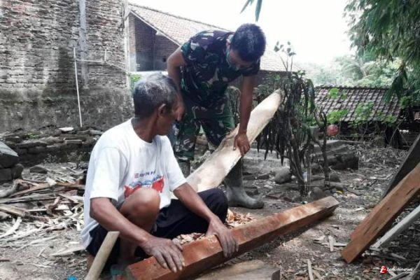 Tampak Sertu Wawan, anggota Satgas TMMD Reguler dari kesatuan Yonif 406 Candra Kusuma yang memiliki skill khusus bangunan, sedang membantu tukang profesi warga setempat, untuk mempersiapkan rangka rumah milik Karmin (38), warga Dusun Kutagaluh RT/RW. 02, Kalinusu, salah satu dari 5 penerima rehab rumah program TMMD dari Kodim Brebes senilai Rp. 10 juta.