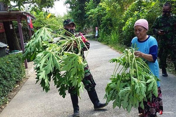 Sertu Muktar satgas TMMD Kodim 0715/Kendal, yang kebetulan lewat segera menghampiri dan memberikan bantuan untuk memetik daun pepaya. Tak terhingga senangnya perasaan Ibu Lastri (61). ‘’Senang dibantu Pak TNI, semoga Allah membalas kebaikan Pak TNI, " paparnya. (Pendim 0715/Kendal)Anto.