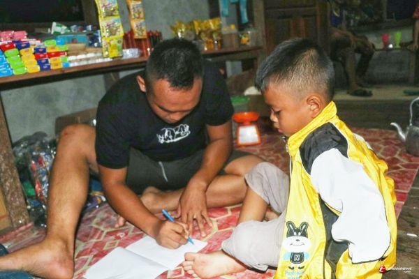 Serda Yosua yang merupakan Anggota Satgas TMMD 109 Kodiim 1205/ Sintang dengan ketulusan hati terlihat sedang membimbing Fajar salah satu Anak SD (Sekolah Dasar) di Desa Tirta Karya Kecamatan Ketungau Tengah Kabupaten Sintang yang sedang bejar di rumahnya.