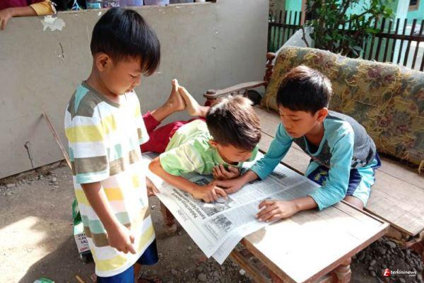 Tampak Wisma (9), murid kelas 3 SDN Kalinusu 03 (kaos biru) dan juga Zidan (10), murid kelas 4 MI Kalinusu, yang merupakan anak-anak Dusun Kedung Kandri RT/RW. 01, Kalinusu, sangat antusias membaca surat kabar di warung di dusunnya itu.