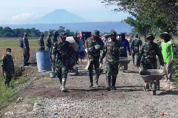 Terus jaga semangat dan kekompakan. Hal itu yang dilakukan oleh anggota Satgas TNI Manunggal Membangun Desa (TMMD) Reguler Ke 109 Kodim 0715/Kendal di Desa Sendang Kulon, Kecamatan Kangkung saat di lokasi pembangunan betonisasi jalan.