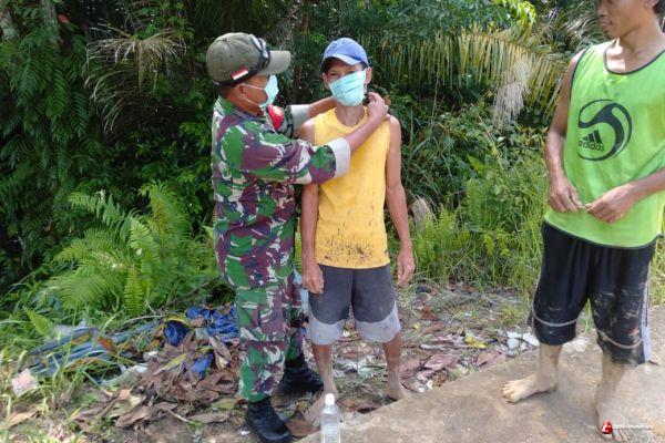 SINTANG - Virus Covid-19 (SARS-CoV-2) bisa berada di mana saja, menempel di benda-benda yang ada di sekitar kita. Sebagai upaya mencegah penyebaran Covid 19, personel TNI yang tergabung dalam Tim Satgas TMMD Reguler ke 109 Kodim 1205/Sintang tak pernah henti untuk mengingatkan dan sekaligus menyambangi warga dan mengajak serta mengimbau agar selalu menggunakan masker dan selalu menjaga jarak.