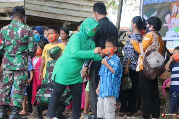 SINTANG - Dansatgas TMMD 109 / Sintang, Letkol Inf Eko Bintara Saktiawan serta Ibu Persit memasangkan masker Kepada anak-anak, sebelum keberangkatan safari bersama ke Perpustakaan Terapung di batas negeri Kodim 1205 / Sintang, Minggu (18/10/2020).