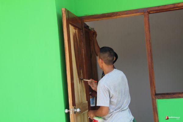 “Kita plitur pintu ini agar warnanya bagus, sehingga warga yang akan menempati nanti betah,” kata Kopda Mumu Aljahid, Kamis (15/10/20).