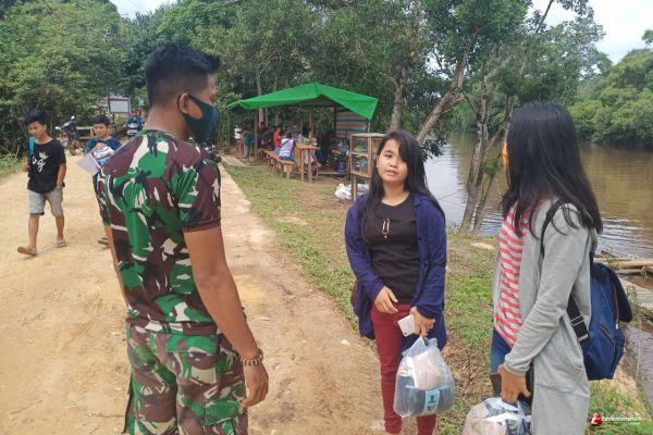 Kopda Riyan menjumpai beberapa remaja putri sepulang belanja dan tidak mengenakan masker. Maka secara otomatis Kopda Riyan mengingatkan remaja putri tersebut untuk wajib mengenakan masker, Senin (19/10/2020).