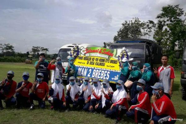 Brebes - Belasan siswa dan sejumlah guru dari MAN 2 Brebes, Kecamatan Bumiayu, Kabupaten Brebes, Jawa Tengah, hadir ke Lapangan Desa Kalinusu, Kecamatan Bumiayu, Kabupaten Brebes, Jawa Tengah, untuk ikut melepas anggota Satgas TMMD Reguler 109 Kodim 0713 Brebes, yang akan kembali ke kesatuannya masing-masing, setelah tugas mereka selesai, dan program TMMD resmi ditutup Dandim Brebes di Pendopo Kabupaten Brebes. Rabu (21/10/2020).