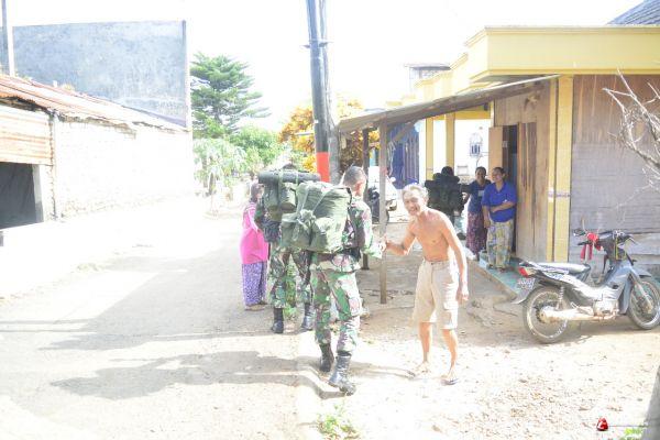 masih menggunakan rangsel besar Pratu kholil bersama anggota satgas lainnya menyapa setiap warga tebluru yang ada.