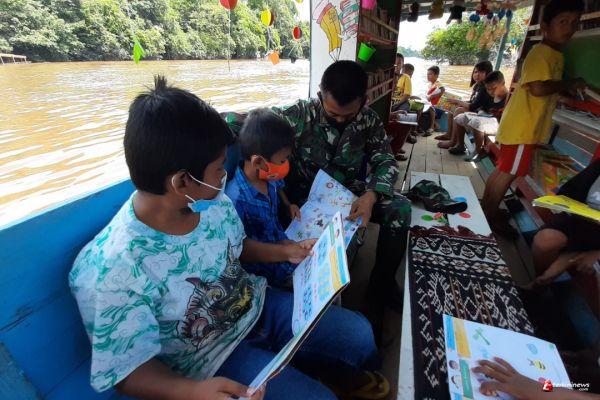 Satgas TMMD Ikut Anak-Anak Belajar di Perpustakaan Apung