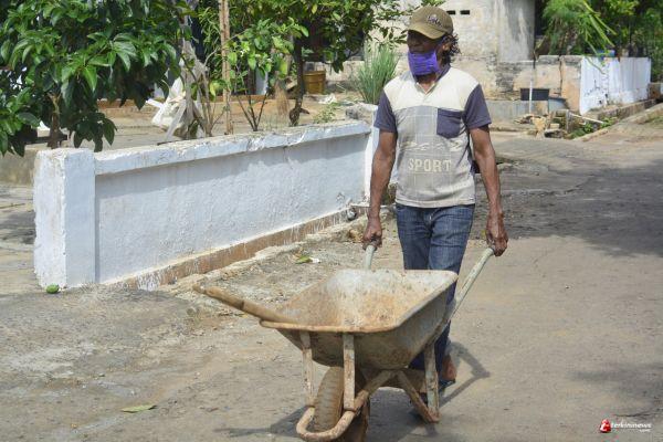 Srinadi, warga Desa Tebluru tak tinggal diam dalam ikut serta berperan aktif dalam mensukseskan TNi Manunggal Membangun Desa (TMMD) ke 109 di kampungnya. Ia rela menarik karung berisi pasir demi membantu TNI. Matahari yang terik dan keringat yang mulai mengucur membasahi kaosnya tak dihiraukan.