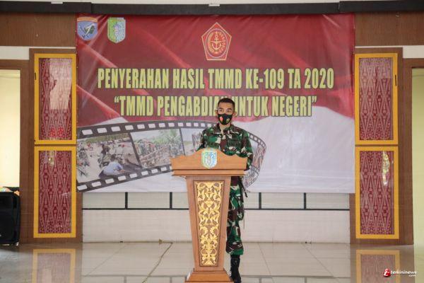 SINTANG - Dandim 1205 Sintang Letkol Inf Eko Bintara Saktiawan menyerahkan hasil TMMD (TNI Manunggal Membangun Desa) Reguler ke-109 tahun 2020 kepada Pjs Bupati Sintang Florentinus Anum, Rabu (21/10/2020). Bertempat di Pendopo Kabupaten Sintang.