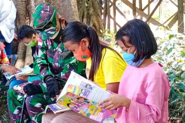 SINTANG- Komandan Satuan Tugas (Dansatgas) TNI Manunggal Membangun Desa (TMMD) Reguler 109 Kodim 1205/ Sintang, Letkol Inf Eko Bintara Saktiawan mendampingi anak-anak di batas negeri membaca buku dari perpustakaan apung.