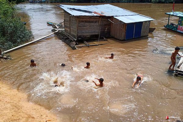 Seakan tak pernah mengenal lelah, mereka terlihat menikmati cuaca terik dengan senda gurau khas anak-anak pedalaman sembari berenang di tengah air yang berwarna coklat susu tersebut.