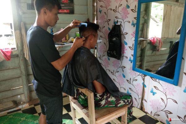SINTANG - Kopda Riyan mencukur rambut agar terlihat rapi sebagai jati diri TNI harus tertata baik.
