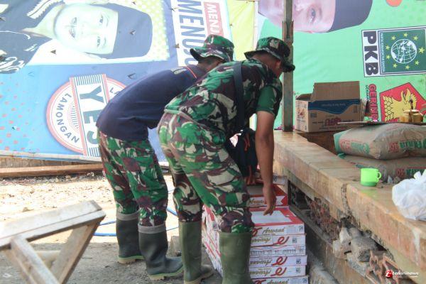 Dua anggota satgas TMMD pun, Kopda Rudi dan Praka Bagas menghitung jumlah keramik yang telah diturunkan agar penggunaannya nanti sesuai dengan pengerjaan.