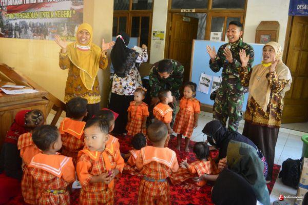 Lamongan- Keberadaan Satgas TMMD 108 kodim 0812 Lamongan di Desa Tebluru bukan hanya membantu masyarakat dari segi fisik saja. Namun juga membagi ilmu dengan mengajari anak untuk bernyanyi bermain maupun membaca.