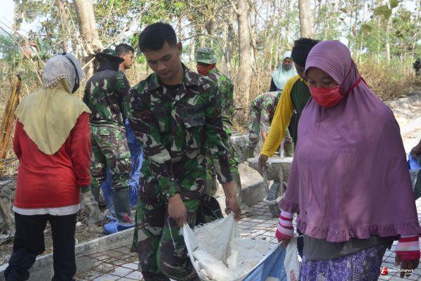 Lamongan – Puluhan prajurit TNI yang tergabung dalam Satgas TMMD ke 109 Kodim 0812/Lamongan di Desa Tebluru Kecamatan Solokuro Kabupaten Lamongan, bersama dengan masyarakat bahu membahu mengangkat Pedel.