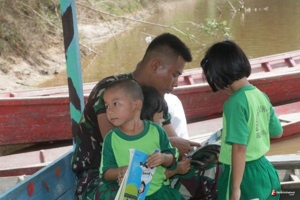 SINTANG - Selagi ada kesempatan Prada Yugo mengajarkan adik-adik membaca dan menulis, Jumat (23/10/2020).