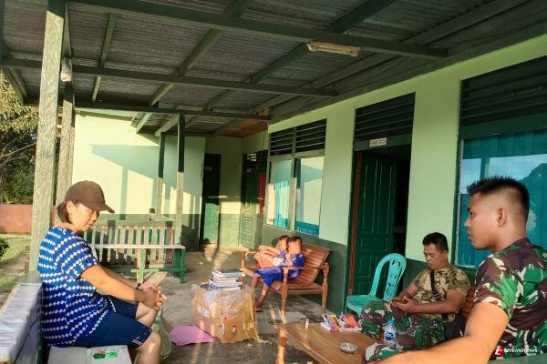 SINTANG - Tetap beroperasi seusai rampungnya kegiatan TMMD, Serda Suparsono berkoordinasi dengan Milla, Kepala Sekolah TK Tunas Harapan, untuk pelaksanaan kunjungan Perpustakaan Apung Batas Negeri ke Dusun Kebanga, Jumat (23/10/2020).