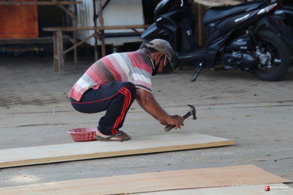 Seperi halnya yang dilakukan Maryono, Kamis (15/10/20) ini, dirinya selalu menggunakan posisi jongkok dalam memaku papan agar dirinya nyaman bekerja.