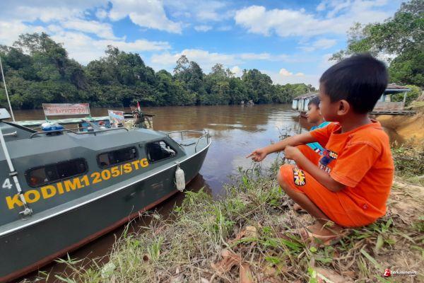 SINTANG - Kapal Motor Cepat (KMC) Milik Kodim 1205 Sintang yang tersandar di dermaga gemar mebaca menarik perhatian anak-anak di Desa Wirayuda Kecamatan Ketungau Tengah. Satu diantaranya Jidan, pelajar kelas 1 Sekolah Dasar ini rela duduk panas-panasan sambil menatap KMC yang tengah ditambatkan personel Satuan Tugas (satgas) TNI Manunggal Membangun Desa (TMMD) Reguler 109 Kodim 1205/ Sintang, Kopda Riyan ke bagian sisi dermaga.