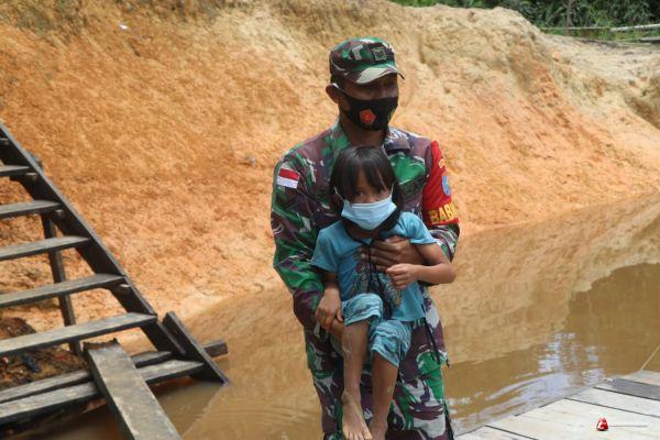 SINTANG - Karena masih terlalu kecil, Sertu Suharyono menggendong adik Nesib yang mau melihat Perpustakaan Apung, Minggu (25/10/2020).