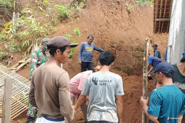 Sebagai langkah penanganan bencana, Babinsa Koptu Sukiman memotori warga setempat untuk melakukan upaya pembersihan material longsor agar tidak membahayakan bagi penghuni rumah.