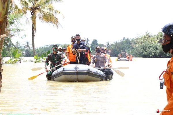 CILACAP - Komandan Kodim (Dandim) 0703 Cilacap Letkol Inf Wahyo Yuniartoto, SE, M.Tr (Han) bersama Bupati Cilacap H. Tatto Suwarto Pamuji meninjau langsung wilayah yang terdampak banjir dengan mendayung perahu di Desa Mujurlor dan Desa Gentasari, Kecamatan Kroya, Kabupaten Cilacap, Jawa Tengah, Rabu (28/10).
