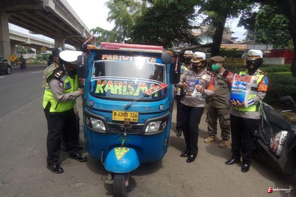 Pada hari kelima operasi zebra jaya 2020, Satuan Lalu Lintas Polres Metro Jakarta Timur bagikan masker dan sembako, di beberapa titik di daerag Jakarta Timur, Jumat (30/10/2020).