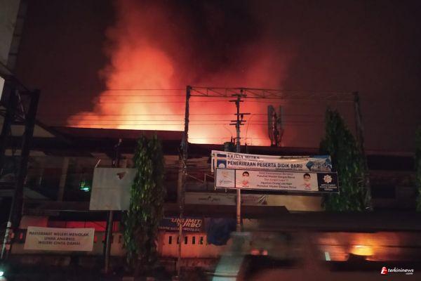 Saat awak media memantau kejadian tersebut, petugas pemadam kebakaran terus berupaya menjinakkan api, kurang lebih 10 unit pemadam kebakaran dikerahkan.