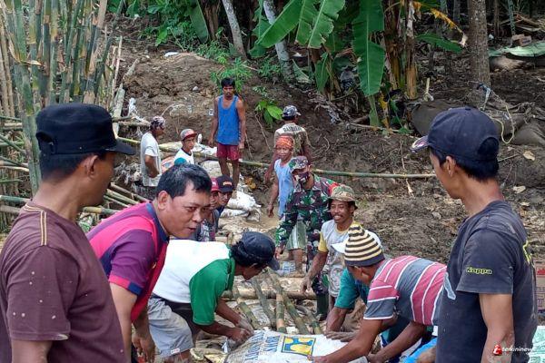 Cilacap - Inilah aksi yang dilakukan Babinsa Koramil 09/Kawunganten. Atasi tanggul Sungai Cimeneng yang jebol, Babinsa Bulaksari Serka Sodirin bersama warga, kerja bakti memperbaiki tanggul jebol dengan menggunakan pagar bambu dan ribuan karung yang diisi dengan tanah. Perbaikan tanggul dilakukan di lokasi RT 3 RW 14 Dusun Klepukerep Desa Bulaksari Kecamatan Kawunganten, Jumat (20/11/20).