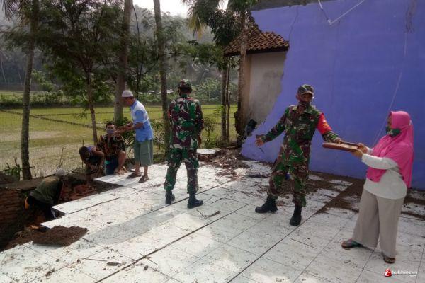 Cilacap - Pasca bencana tanah longsor di desa Panimbang seminggu yang lalu, kini anggota koramil 14 Cimanggu bersama warga melaksanakan karya bakti membersihkan sisa - sisa material tanah longsor yang menimpa TK Sinar Abadi Desa Panimbang Kecamatan Cimanggu Kabupaten Cilacap, Senin (23/11/2020).