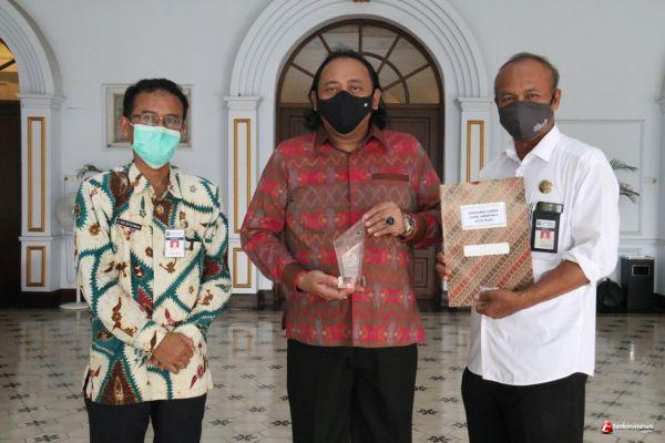 Kepala Disperkim Ir. Eko Setyawan, M.UM langsung menyerahan plakat penghargaan Hari Habitat kepada Wali Kota Tegal H. Dedy Yon Supriyono, S.E., M.M., yang didampingi Sekda Kota Tegal Dr. Drs. Johardi, M.M., di Pringgitan Rumah Dinas Wali Kota Tegal, Rabu (2/12/2020) sore.