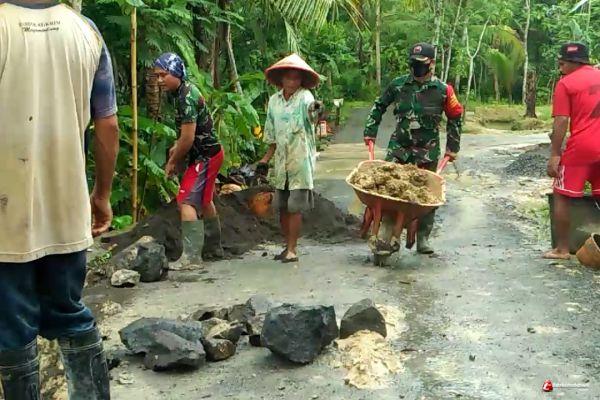 Menyikapi kejadian tersebut, Aparat TNI dari Koramil 02/Jeruklegi turun ke lokasi kejadian dan bersama warga masyarakat setempat kerja bakti memperbaiki talud jalan yang longsor, Selasa (15/12/20).
