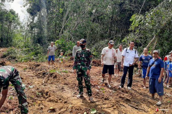Satgas Pamtas RI-Malaysia Yonif 407/PK Pos Klawik Gotong royong membantu masyarakat membuka hutan untuk pembuatan Jalan Usaha Tani (JUT) di Dusun Bakul, Desa Labian Ira'ang, Kecamatan Batang Lumpar, Kabupaten Kapuas Hulu, Kalbar. Kamis (17/12/20)