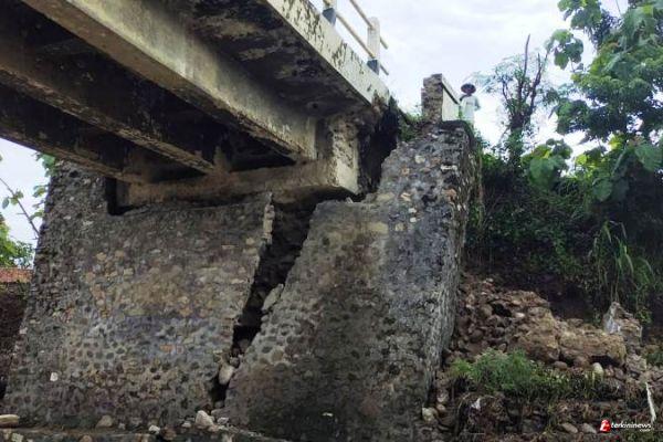 Brebes – Pondasi Jembatan Karangbokong, di Desa Kamal, Kecamatan Larangan, Kabupaten Brebes, Jawa Tengah, retak dan terancam ambrol akibat tergerus arus Sungai Rambatan.