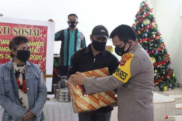 MAROS,-- Jelang Puncak Perayaan Natal Tahun 2020, Kepolisian Resor Maros menggelar kegiatan Bakti sosial dengan mengunjungi Jemaat sejumlah gereja di Kabupaten Maros.
