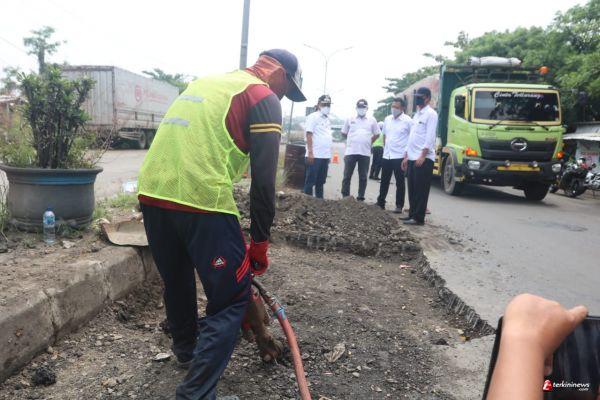Muhamad Jumadi didampingi Kepala Bidang Bina Marga, Dinas Pekerjaan Umum dan Penataan Ruang (DPUPR) Kota Tegal, Setyo Budi melakukan pengecekkan langsung perbaikan sebagian Jl. Mataram yang mengalami kerusakan parah dibeberapa titik.