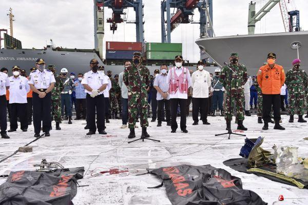 Panglima TNI Marsekal TNI Hadi Tjahjanto, S.I.P. bersama Menteri Perhubungan (Menhub) Budi Karya Sumadi, Kepala Staf Angkatan Laut (Kasal) Laksamana TNI Yudo Margono, S.E., M.M., Kepala Badan Nasional Pencarian dan Pertolongan (Kabasarnas) Marsdya TNI Bagus Puruhito dan Ketua Komite Nasional Keselamatan Transportasi (KNKT) Soerjanto Tjahjono, menggelar konferensi pers terkait ditemukannya Flight Data Recorder (FDR) pesawat Sriwijaya Air SJ-182, bertempat di Dermaga JICT II, Tanjung Priok, Jakarta Utara, Kamis (14/1/2021).