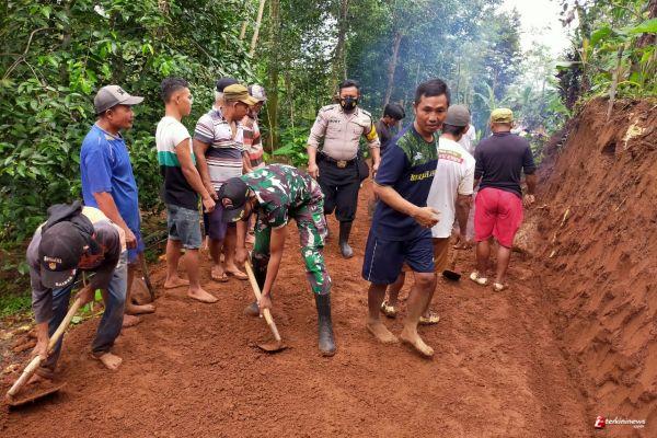 Babinsa Koramil 06 /Tersono Serda Joko Riono bersama Babinkamtibmas dan warga Dukuh jati Kecamatan Tersono melaksanakan karya bakti pembuatan jalan lingkar pedukuhan, Jum'at, (15/01/2)
