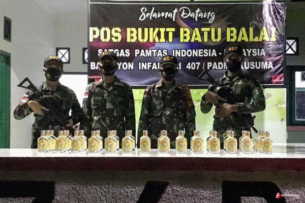 Satuan Tugas Pengamanan Perbatasan (Satgas Pamtas) Yonif 407/Padmakusuma Pos Sei Seria, menggagalkan upaya penyelundupan barang ilegal berupa 42 botol miras merk Lemon Gin yang akan dimasukkan ke Indonesia melalui jalur tikus di kampung Sei Seria, Kecamatan Ketungau Hulu, Kabupaten Sintang, Kalimantan Barat. Kamis (14/01/21)