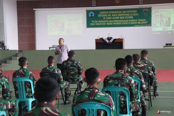 Puluhan prajurit tamtama, bintara dan perwira serta Persit di Batalyon Yonif 403/WP Kamis (21/1/2021) mendapatkan motivasi dari pakar komunikasi dan motivator nasional Dr. Aqua Dwipayana. Motivasi yang diberikan tersebut sebagai upaya untuk persiapan satuan Yonif 403/WP menjelang keberangkatan sebagai prajurit Satgas Pamtas RI-PNG dalam waktu dekat ini.