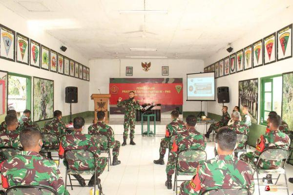 Prajurit satuan tempur (Satpur) Yonif 403/WP yang direncanakan akan diberangkatkan serta melaksanakan tugas operasi Pengamanan Perbatasan (Pamtas) RI-PNG di Papua bulan Februari 2021 mendatang, Jumat (22/1/2021) pagi menerima materi pembekalan tentang Pembinaan Teritorial (Binter) Wilayah Perbatasan dari Pabandya 2/Binpottaswilnas Paban V!/Taswilnas Ster TNI, Letkol Inf Tarmuji.