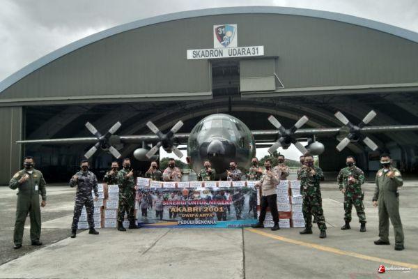 JAKARTA- Batalyon Dwipa Arya, Alumni Akabri Tahun 2001 melaksanakan kegiatan bakti sosial dengan berbagi bantuan kepada masyarakat terdampak bencana di Sulawesi Barat dan Kalimantan Selatan. Sekitar Delapan Ton bantuan dikirim menggunakan Pesawat Hercules C-130 TNI AU, Jumat (29/1/2021).