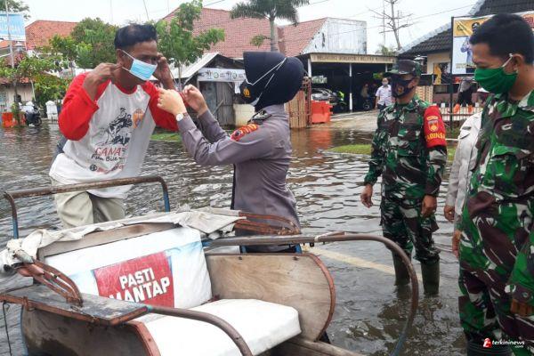 Sembari cek lokasi perkampungan warga yang tergenang air hujan menyerukan imbauan protokol kesehatan, petugas juga memberikan masker gratis sebanyak 150 pcs kepada warga yang belum memakai masker.