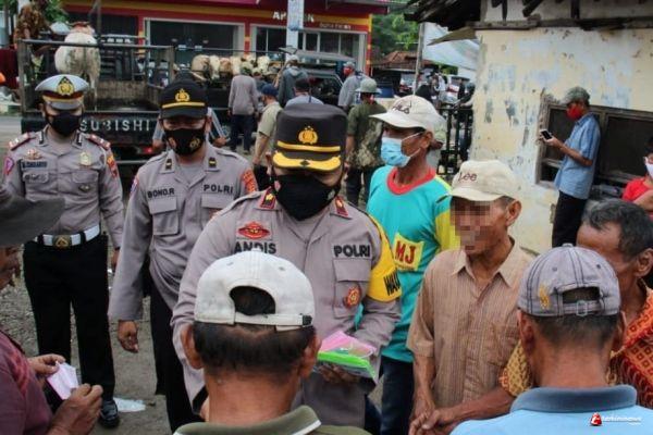 Melalui pengeras suara berulangkali Kompol Andis mengingatkan pengunjung untuk mentaati protokol kesehatan, utamanya penggunaan masker. Tak sampai disitu saja, Kompol Andis bersama rombongan juga membagikan masker untuk pengunjung pasar dan menghimbau untuk menjaga jarak.