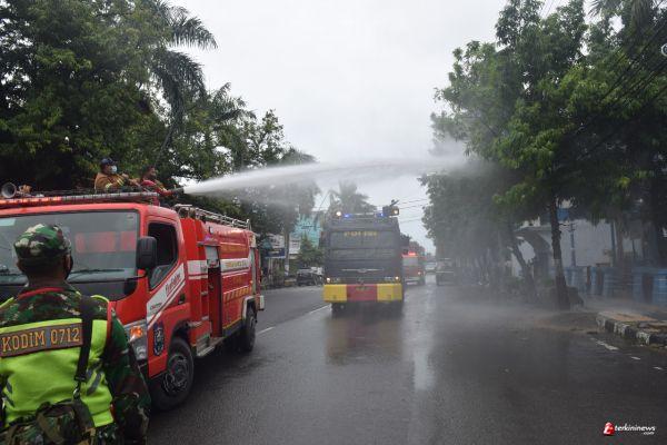 TEGAL - Hari pertama Program Gubernur Jawa Tengah Ganjar Pranowo “Jateng 2 Hari Di Rumah Saja” di gunakan Polres Tegal Kota bersama TNI, Polri, Satpol PP dan Dinas Pemadam Kebakaran Kota Tegal untuk melakukan patroli skala besar dan penyemprotan disinfektan, Sabtu (06/02/2021).