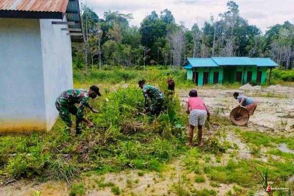 Satgas Pamtas Yonif 407/PK Karya Bhakti Pembersihan Halaman Balai Desa Sei Kelik