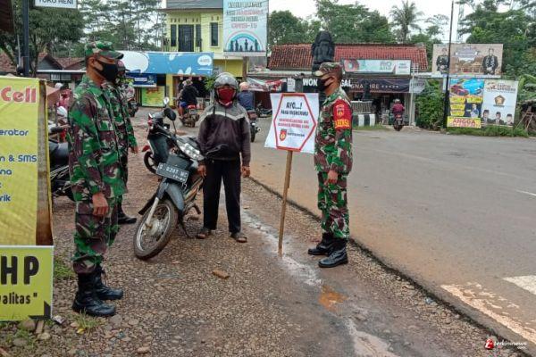 BATANG- Satgas Covid-19 yang terdiri atas TNI - Polri dari Koramil 08 Wonotunggal dan Polsek Wonotunggal menggelar operasi yustisi pendisiplinan penerapan protokol kesehatan di Jalan Raya Batang - Bandar dekat lokasi Pasar Tradisional Wonotunggal, Kecamatan Batang, Kabupaten Batang, Kamis (11/2/21)