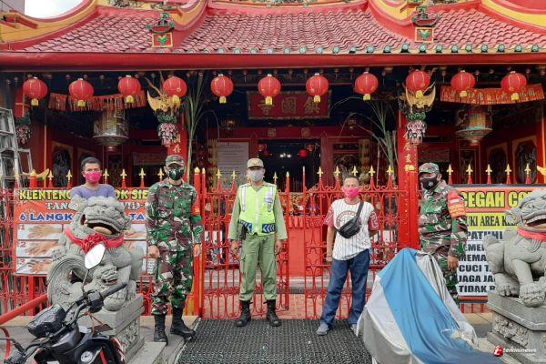 SURAKARTA- Babinsa Kelurahan Sudiroprajan Koramil 04/Jebres Kodim 0735/Surakarta Serda Hidayat dan Serda Agus S Memantau perayaan ibadah Tahun Baru Imlek Ke 2572 Tahun 2021 di Klenteng Tien Kok Sie Pasar Gede Surakarta Jln. RE. Martadinata Kota Surakarta. Jumat (12/02/2021)