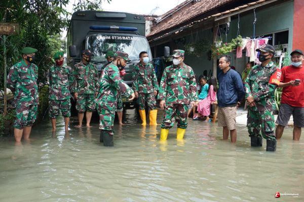 BATANG -- Tak menunggu lama dengan adanya informasi terjadi banjir yang menggenangi pemukiman warga RT 01 RW 01 Desa Kalipucang Wetan, Kecamatan Batang, Dandim 0736/Batang Letkol Arh Yan Eka Putra langsung mendatangi lokasi banjir serta menyerahkan bantuan berupa sembako kepada warga yang terdampak banjir, Minggu (21/2/21)